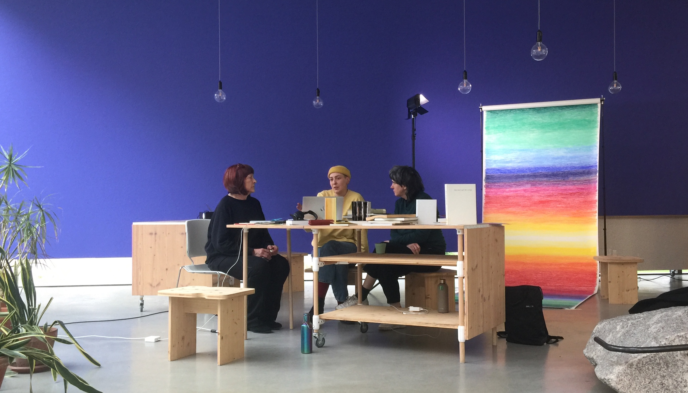 Anwesend sind Angelika Waniek (Idee & Konzept), Henriette Aichinger (Konzept und analoge Gestaltung), Kristina Patzelt (Produktionsleitung), Elena Strempek (Konzept & Kunstbibliothek) und Zora Asse & Cristina Zickert (Gestaltung Webseite)