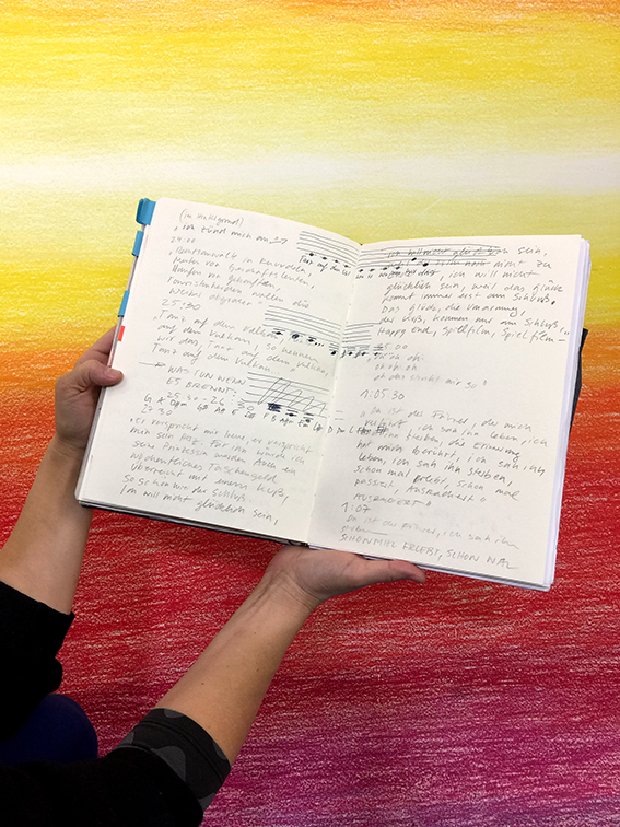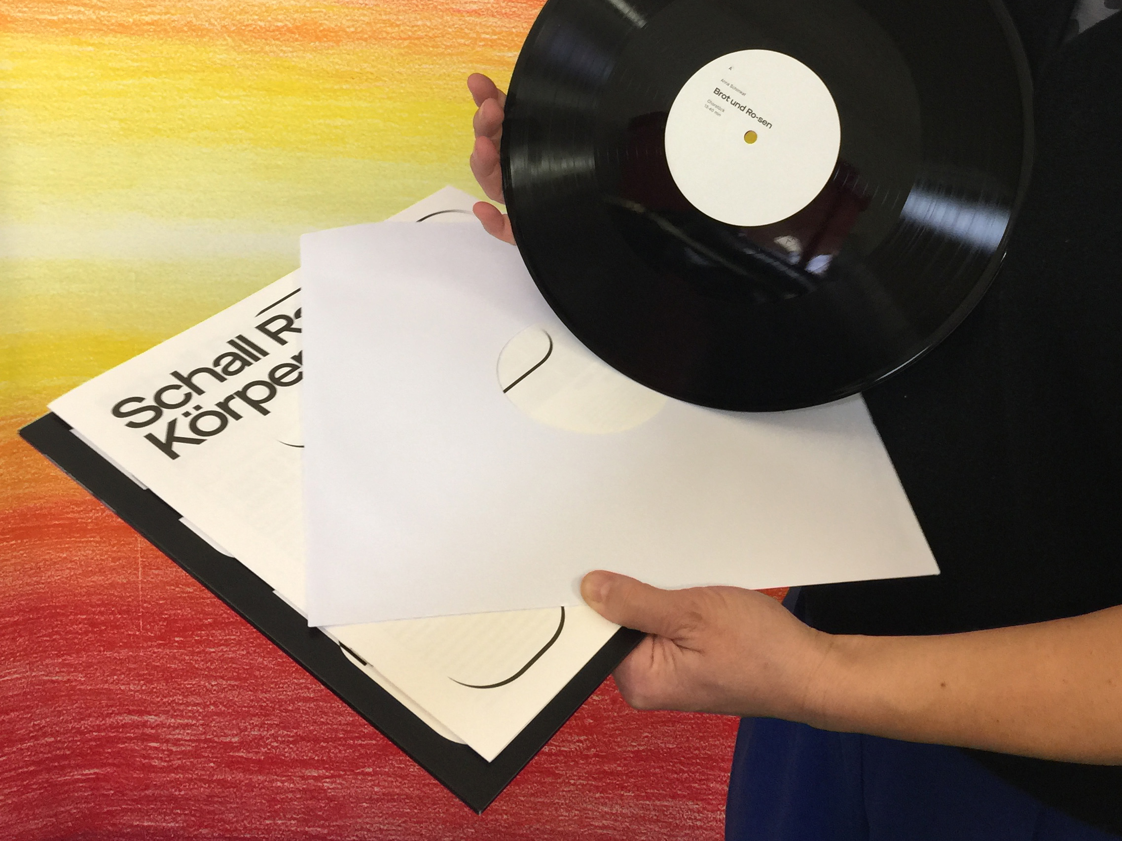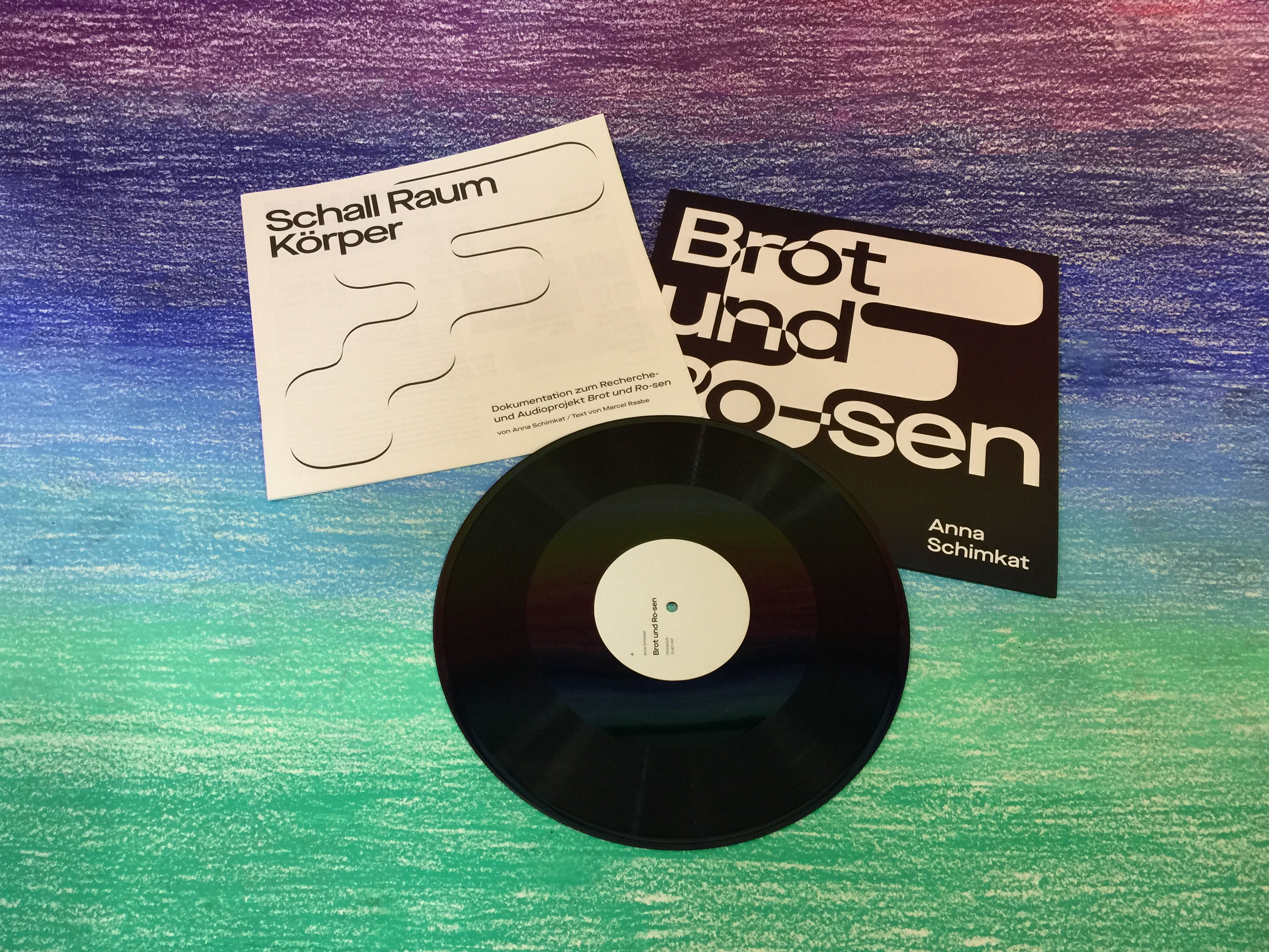 Anna: Ich habe heute meine Schallplatte Brot und Ros-en mitgebracht. Ich bezeichne sie als Publikation, als erweitertes Kunstwerk in dem Sinn, weil dieses Projekt aus einer Installation, aus einer Performance zur Schallplatte mit Text und Booklet geworden ist. Ganz wichtig ist, dass der Prozess dieser ganzen Arbeit darin dokumentiert ist. Als Booklet und eben auch ist die Arbeit noch erweitert um einen Text zu dem Thema Schall/Raum/Körper, der in Zusammenarbeit mit Marcel Raabe entstanden ist.